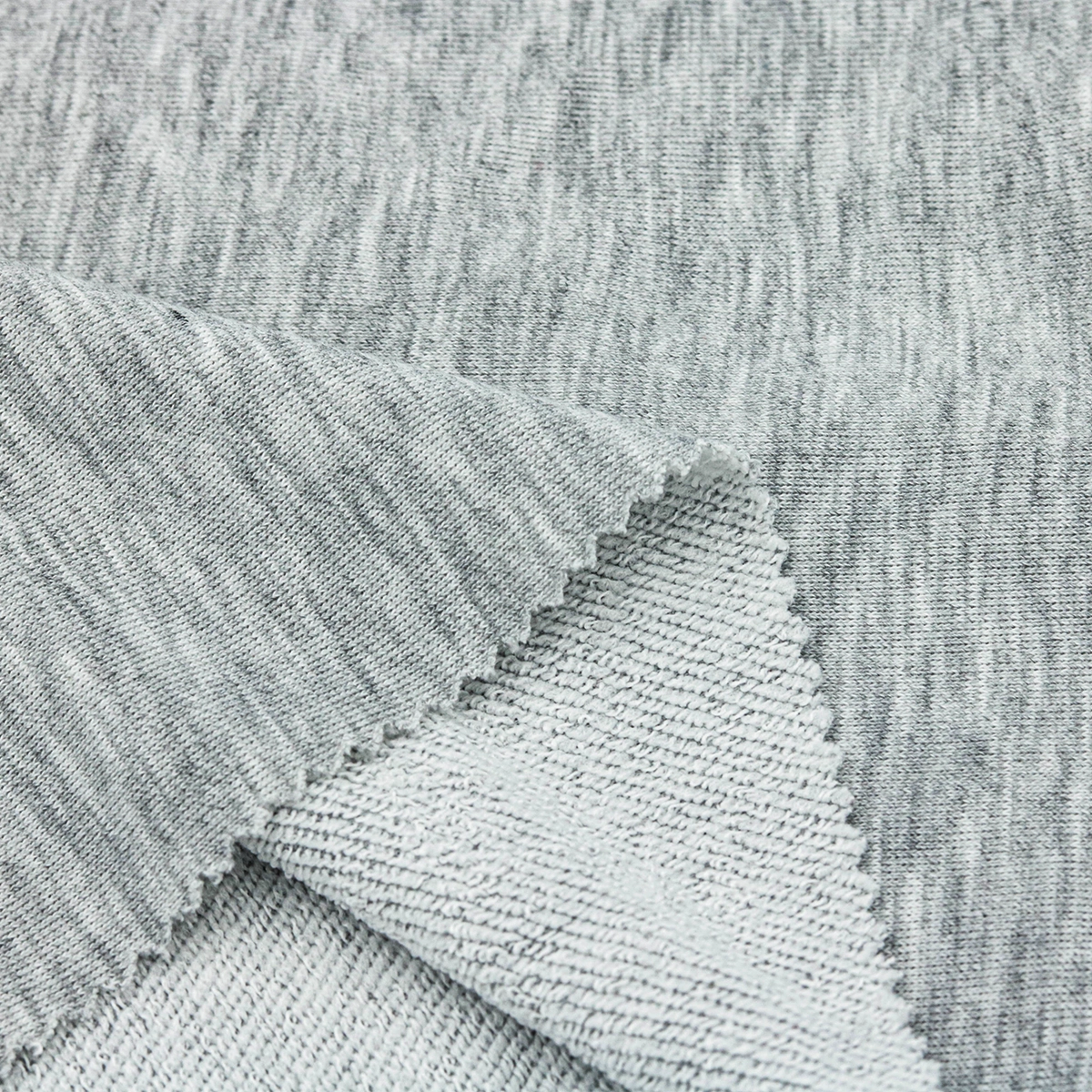 French terry fabric has a smooth surface on one side and uncut loops with soft yarn piles on the other. This item comes in melange color which a color effect obtained by mixing of fibers in different colors before the blend. French terry fabric is usually used in loungewear, sweatsuit sets, hoodies, and pullovers.