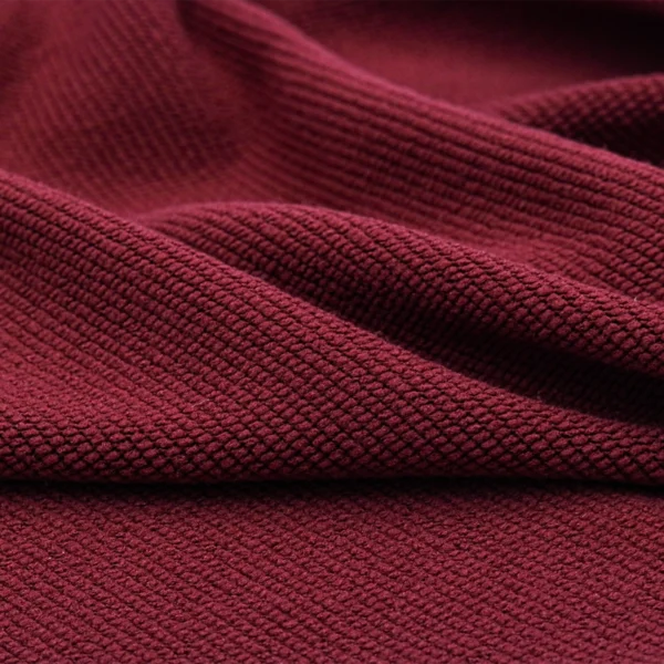French terry fabric is available in crimson red. It has a warm feeling and quite soft. Often used for loungewear, sweatsuit sets, hoodies, and pullovers.